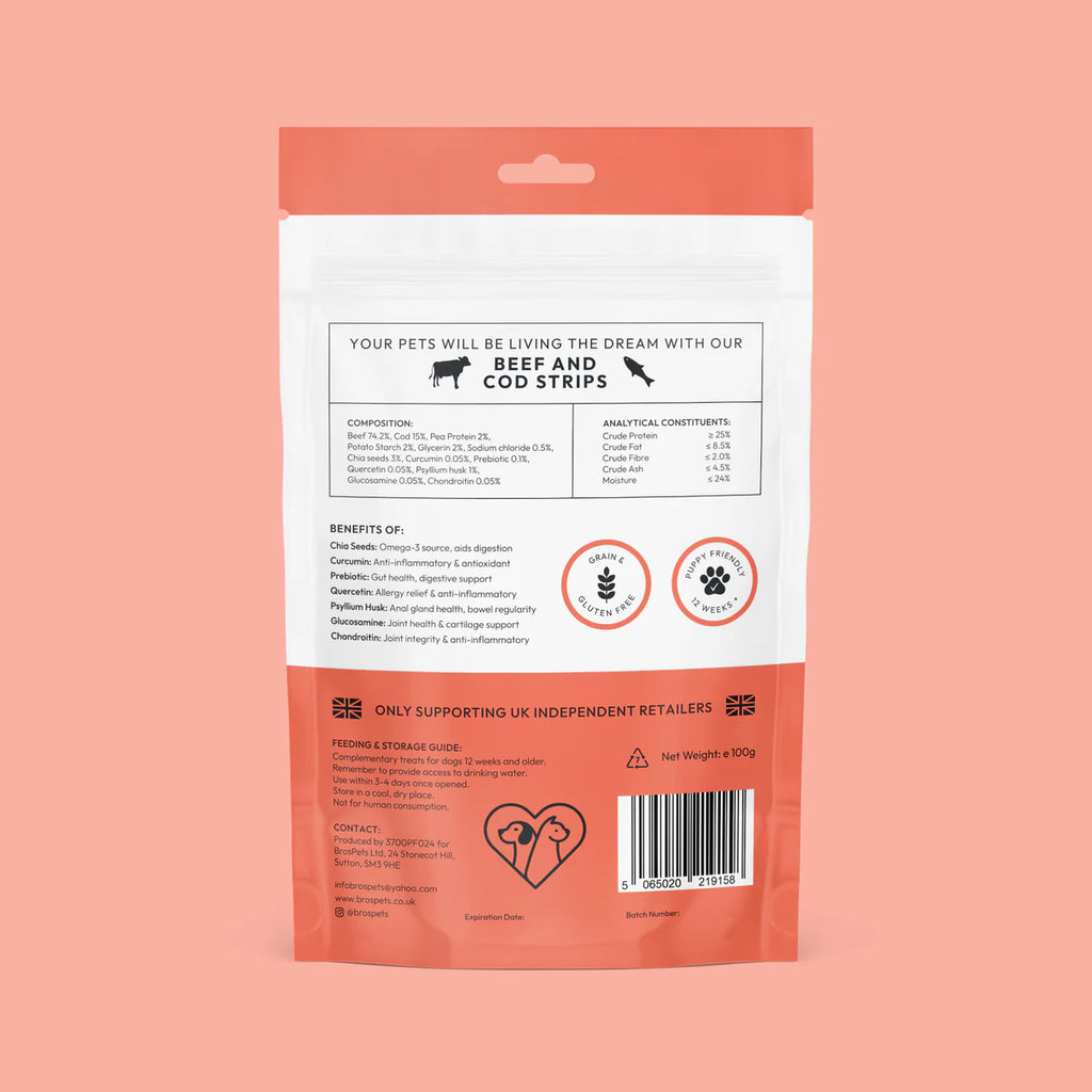 Packed with a range of health benefits, Bros Pets Beef and Cod Strips are the perfect new addition to your pets diet. The whole range is grain and gluten free, puppy friendly (12 weeks+).