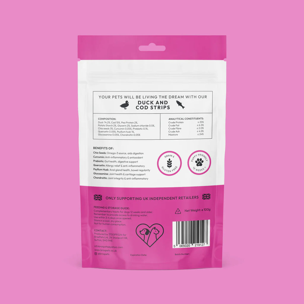 Packed with a range of health benefits, Bros Pets Duck and Cod Strips are the perfect new addition to your pets diet. The whole range is grain and gluten free, puppy friendly (12 weeks+).