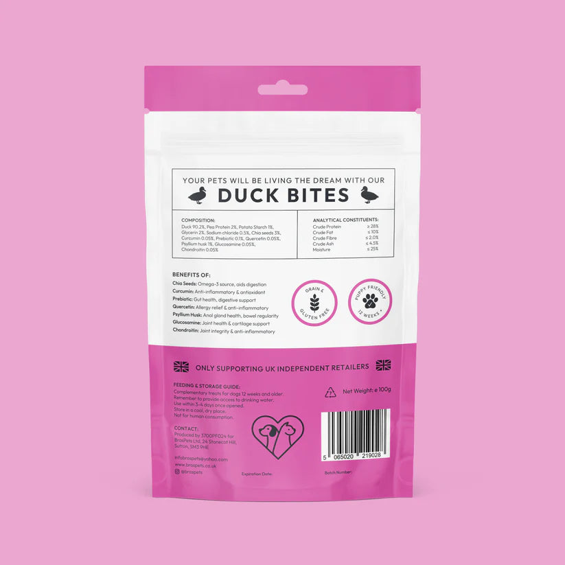 Packed with a range of health benefits, Bros Pets Duck Bites are the perfect new addition to your pets diet. The whole range is grain and gluten free, puppy friendly (12 weeks+) and suitable for cats and dogs.