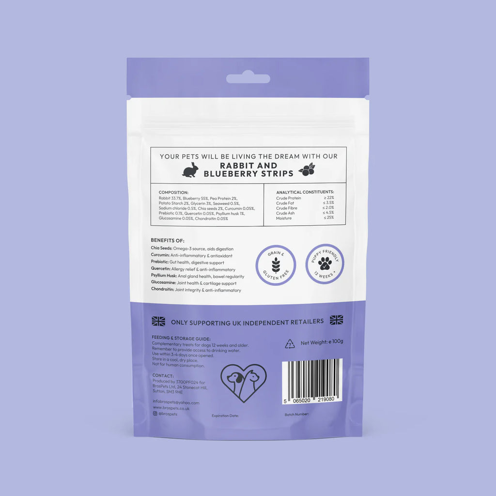 Packed with a range of health benefits, Bros Pets Rabbit and Blueberry Strips are the perfect new addition to your pets diet. The whole range is grain and gluten free, puppy friendly (12 weeks+).