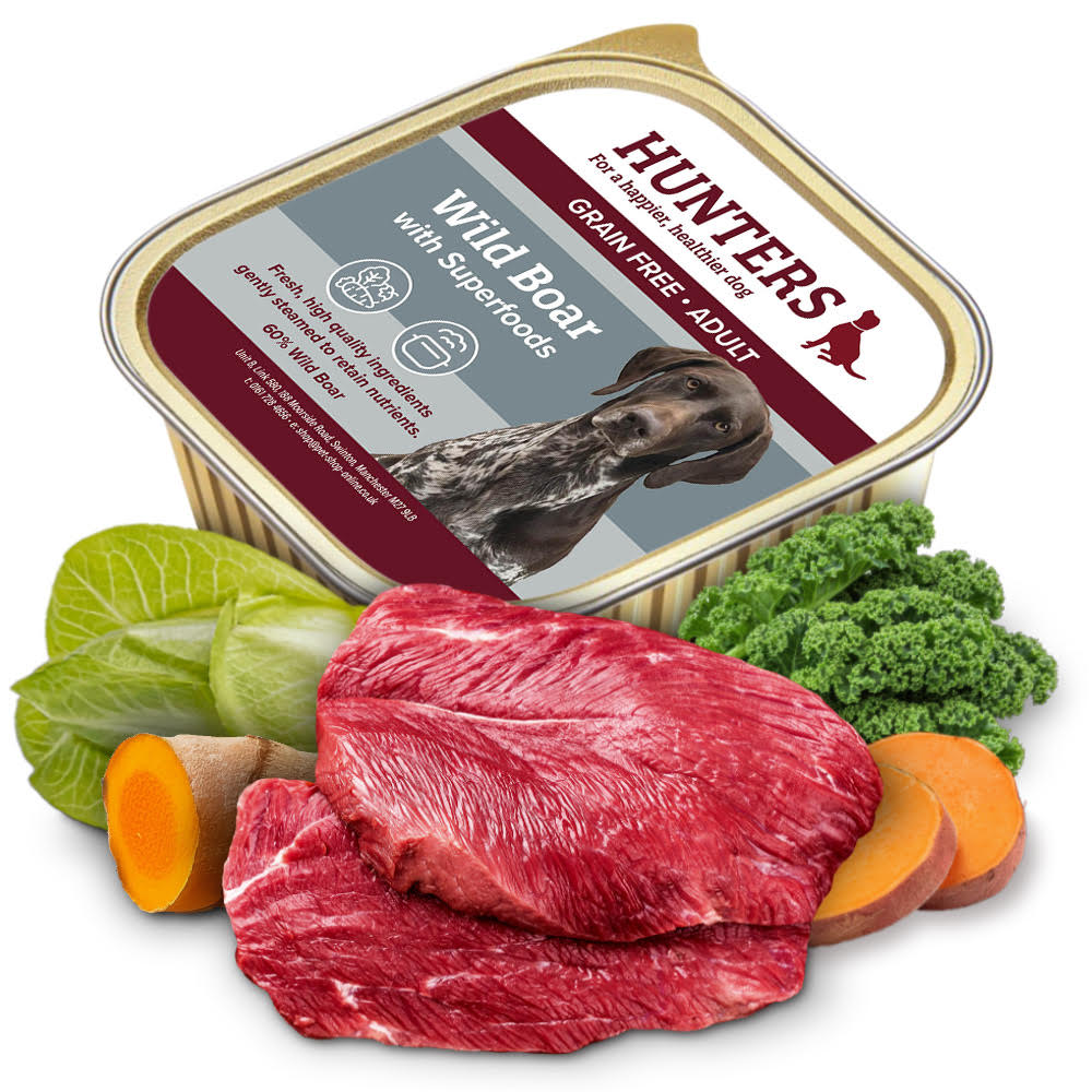 Composition: 60% wild boar, 29.8% broth, vegetables (5% sweet potato, 3% kale, 1% chicory), minerals, vegetable-by-products (0.1% curcuma), algae (0.1% spirulina).