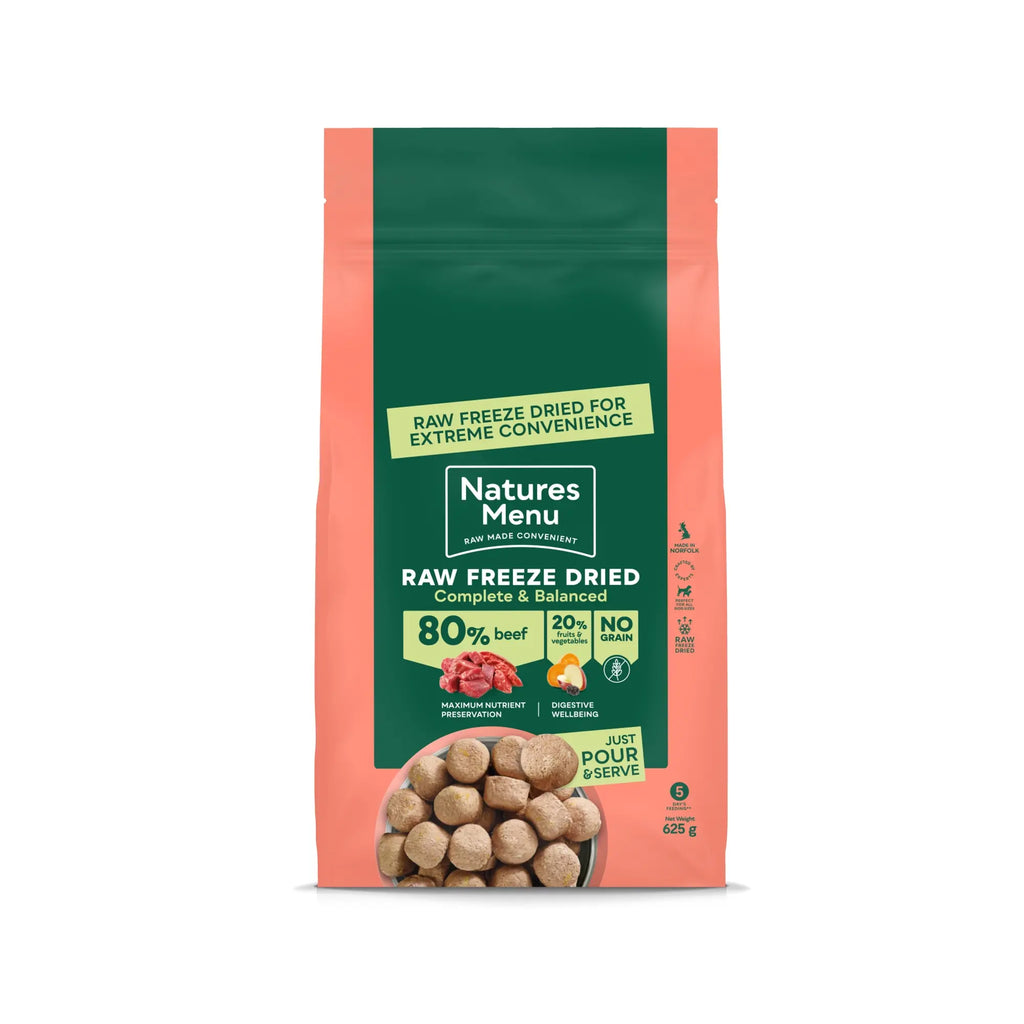 Enjoy all the benefits of a raw diet without any of the hassle! Nature's Menu Raw Freeze Dried has been carefully crafted to offer the perfect blend of convenience and nutrition in one bag! It combines the natural goodness of raw food with a freeze-drying process to produce a delicious meal your dog will thrive on. All you need to do is simply pour and serve!