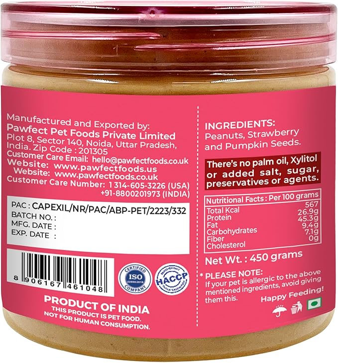This pawfect peanut butter combines naturally sweet strawberries with nutrient-dense pumpkin seeds to create a tasty, health-supportive treat your dog will love. Packed with protein and healthy fats, it helps fuel active dogs with sustained energy while supporting muscle development and heart health.