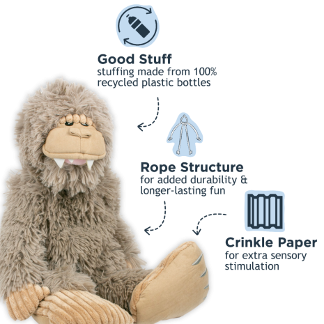This plush toy line is designed with cuddles and auditory stimulation play in mind. Made with sturdy materials, stitched together with reinforced mesh fabric for reassured durability, to be your pup's new favourite toy to cuddle, retrieve, and tug.